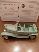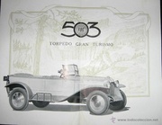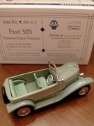 Gli Autodelta 43 puntano tutto su di una incredibile finezza dei particolari, che se non sono tutti in vera scala 1/43 poco ci manca. Il realismo è eccezionale. All' opposto la filosofia di Officina 942, che ricerca l' essenzialità e l' eleganza delle confezioni. Di questo marchio è uscita la settimana scorsa la referenza SB04, cioè la Fiat 503 torpedo del 1927. Negli anni '20 la Fiat adottò il classico radiatore a timpano, montato su tutti i loro modelli. L' esemplare reale di riferimento di questa miniatura, invece, sfoggia un radiatore tondeggiante come quello della 501, ormai desueto nel 1927, come si vede nella foto della vera tratta da un catalogo dell' epoca. Tornando al modellino, in scala 1/43 e in metallo bianco, noto una maggiore cura nel montaggio, una nichelatura di parabrezza, radiatore e cerchi, pieni come nella vera, di grande effetto e la solita ottima verniciatura, ben realizzata anche nello stacco tra i due grigi nella linea di cintura. Curiosamente sia Autodelta43 che Officina 942 limitano la produzione a 50 esemplari.